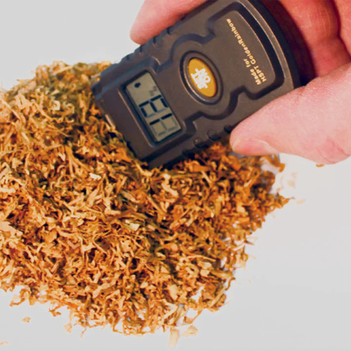 Verwende ein Messgerät, um sicherzustellen, dass die Feuchtigkeit des Tabaks zwischen 12 % und 20 % liegt.